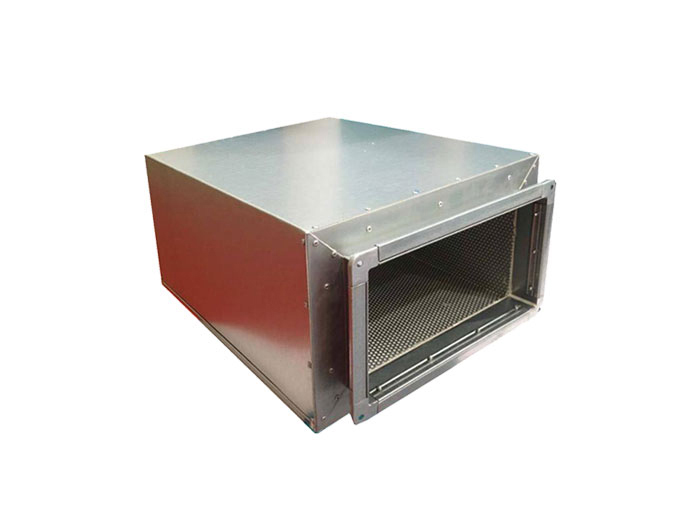 消聲降噪靜壓箱包括靜壓箱本體,靜壓箱本體的上表面和靜壓箱本體的底面均開設有通口,靜壓箱本體的內側壁通過銷軸鉸接有兩組等距離排列的消聲片,兩組消聲片相互靠近的一側面均固定連接有松緊帶,靜壓箱本體的內側壁固定連接有定位板,定位板的上表面固定連接有兩個吸音棉,兩個吸音棉相互遠離的一側面均與靜壓箱本體的內側壁固定連接,定位板的上表面固定連接有彎板,靜壓箱本體的內側壁固定連接有蜂窩板,蜂窩板的下方設有過濾網,定位板的上表面開設有四個通風口。